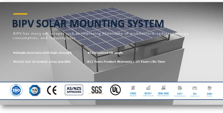 BIPV 솔라 마운팅 시스템은 일반적으로 평평한 오픈 필드 그라운드 또는 옥상에 적용됩니다 . 콘크리트 기초가 있는 장착형 태양광 구조물은 구축이 용이합니다. 설치가 훨씬 쉽습니다. 솔라 마운트 랙킹 의 주요 구성 요소는 공장에서 사전 조립되어 현장 설치 시간과 비용을 많이 절약할 수 있습니다. 구성 요소는 작은 부품에도 전면 양극 산화 처리되어 부식 방지 효과가 뛰어나고 수명이 깁니다.