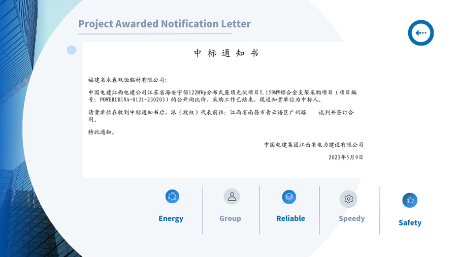 우리는 Kinsend(Shuangheng Aluminium)가 새로운 프로젝트를 수상했음을 발표하게 되어 매우 기쁩니다. Power China Jiangxi Electric Power Construction Co., Ltd.는 Kinsend(Shuangheng Aluminium)가 120MW 광전지 분산 지붕 태양광 프로젝트 의 5.159MW 알루미늄 지원 조달 에 대한 최종 승인자로 선정되었다고 발표했습니다 .