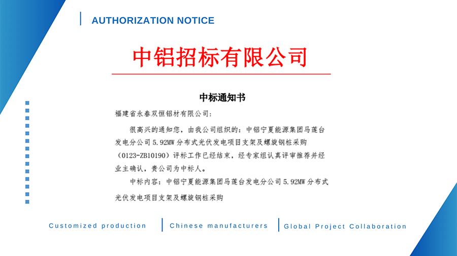 China Aluminium Ningxia Energy Group의 Maliantai 발전 지점으로부터 5.92MW 태양광 발전 프로젝트를 위한 태양광 접지 브래킷 및 접지 나사 에 대한 입찰 승인 통지서를 받은 것을 매우 영광으로 생각합니다 . 중국 알루미늄 닝샤 에너지의 신뢰와 지원에 감사드립니다.