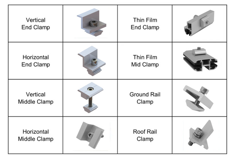 - 솔라 클램프는 대부분의 유형의 솔라 패널 및 레일과 함께 사용할 수 있습니다.