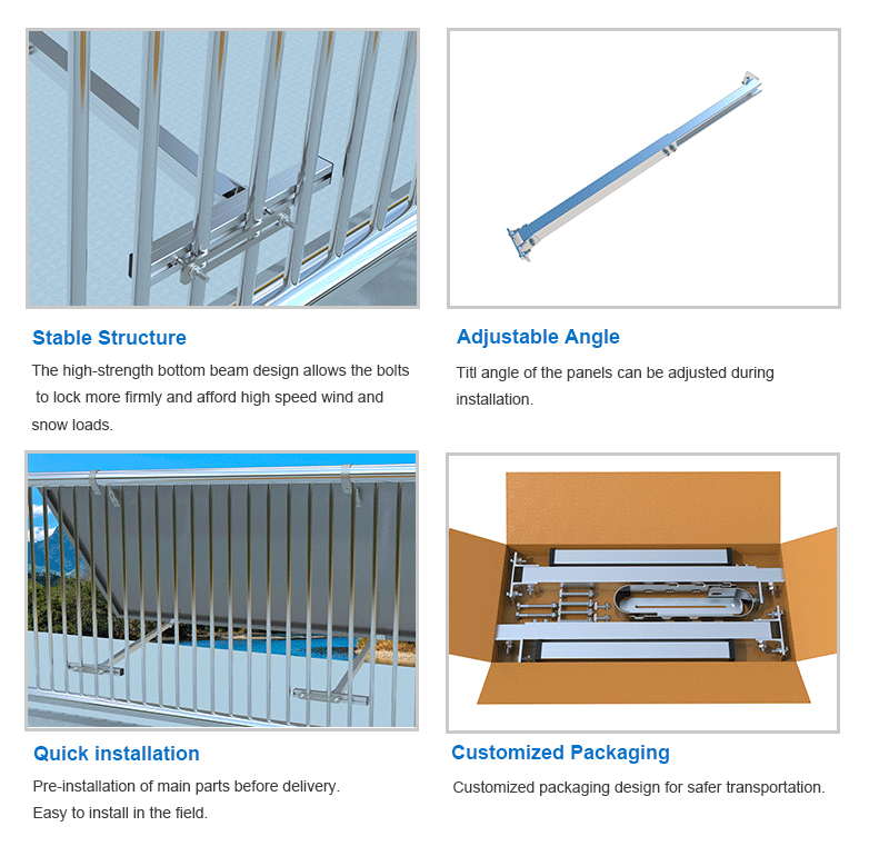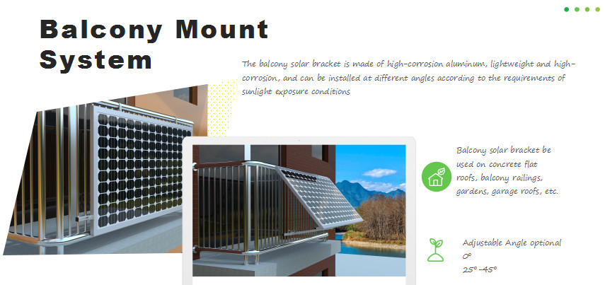 발코니 태양광 마운트 시스템 은 부식성이 높은 알루미늄, 가볍고 부식성이 높으며 햇빛 노출 조건의 요구 사항에 따라 다양한 각도로 설치할 수 있습니다. 발코니 태양광 브래킷은 콘크리트 평평한 지붕, 발코니 난간, 정원, 차고 지붕 등에 사용됩니다.