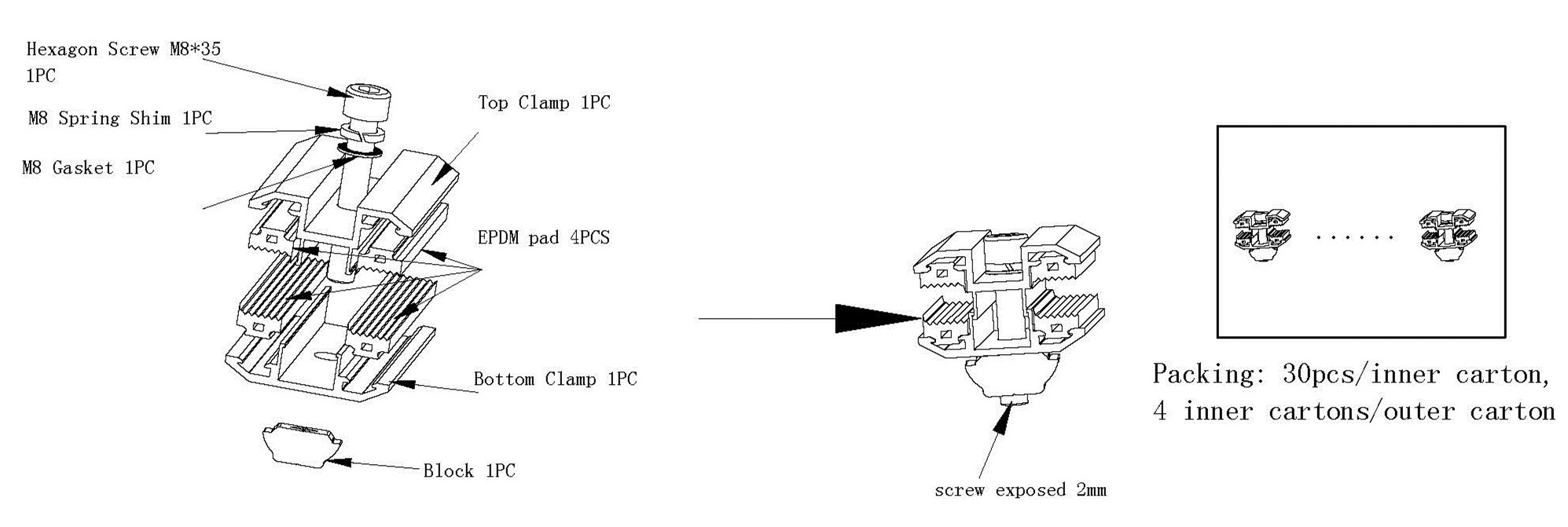 The 박막 미드 클램프 for 태양 전지판은 알루미늄 AL6005 - T5, 결합 된 와 EPDM 패드, frameless 를 단단히 조입니다. 레일의 패널. 실행 가능 for 패널 with 두께 6 - 10mm. 이전 - 조립 됨 공장에서 어떤 저장 당신의 현장 설치 시간 및 비용.